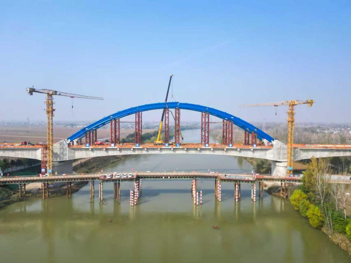 该连续梁拱上跨通航河道沙河,是本项目控制性工程、重难点工程,具有孔跨结构大、技术要求高,施工难度大、安全风险高等特点。拱肋采用厂内集中加工,现场搭设临时支撑架+分段吊装的方式进行安装。桥梁拱肋跨度为136米,单幅划分为13个节段,拱肋最高点距梁面28.7米、最重节段20.2吨。