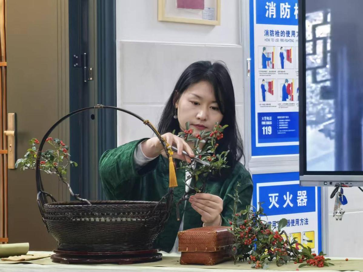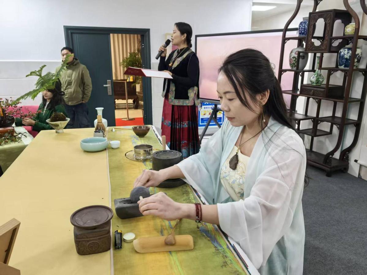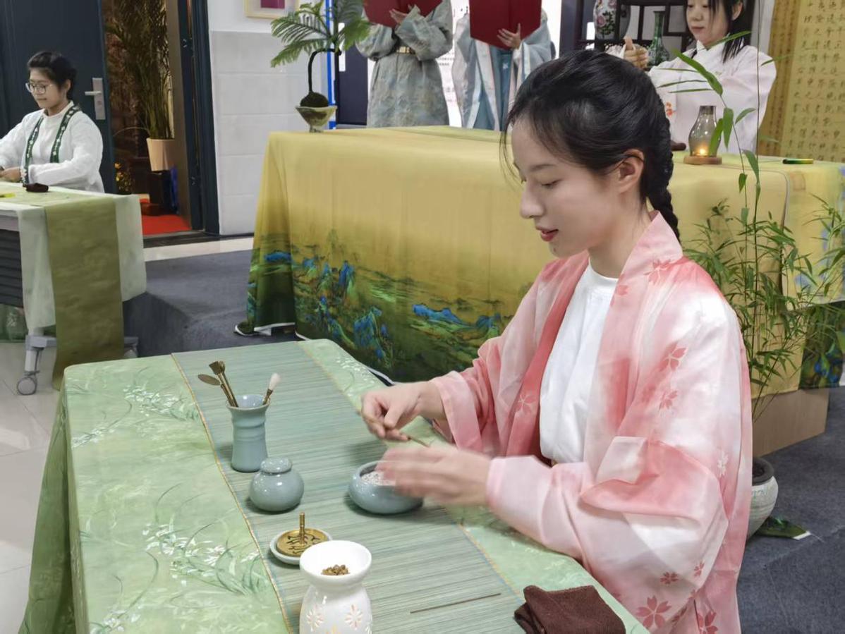 活动在极具仪式感的氛围中拉开序幕。在“心象之寓·插花 茶沫之趣·点茶”篇章,非遗插花技艺资深导师邢艳老师现场演绎宋式“理念花”。她以清雅、疏影为韵,于一瓶一叶间,诠释宋代文人寄托心境的草木情怀。与此同时,宋代点茶传承者云曦老师则带来了精妙绝伦的“七汤点茶法”。从炙茶、碾罗、候汤到击拂,每一步都严谨而充满诗意。当细腻如雪乳的茶沫在茶盏中浮现,云曦老师将点好的茶汤分奉给现场师生。茶香袅袅中,师生们不仅品味到了千年前的滋味,更亲身体验了宋人“矮纸斜行闲作草,晴窗细乳戏分茶”的闲适与雅趣。