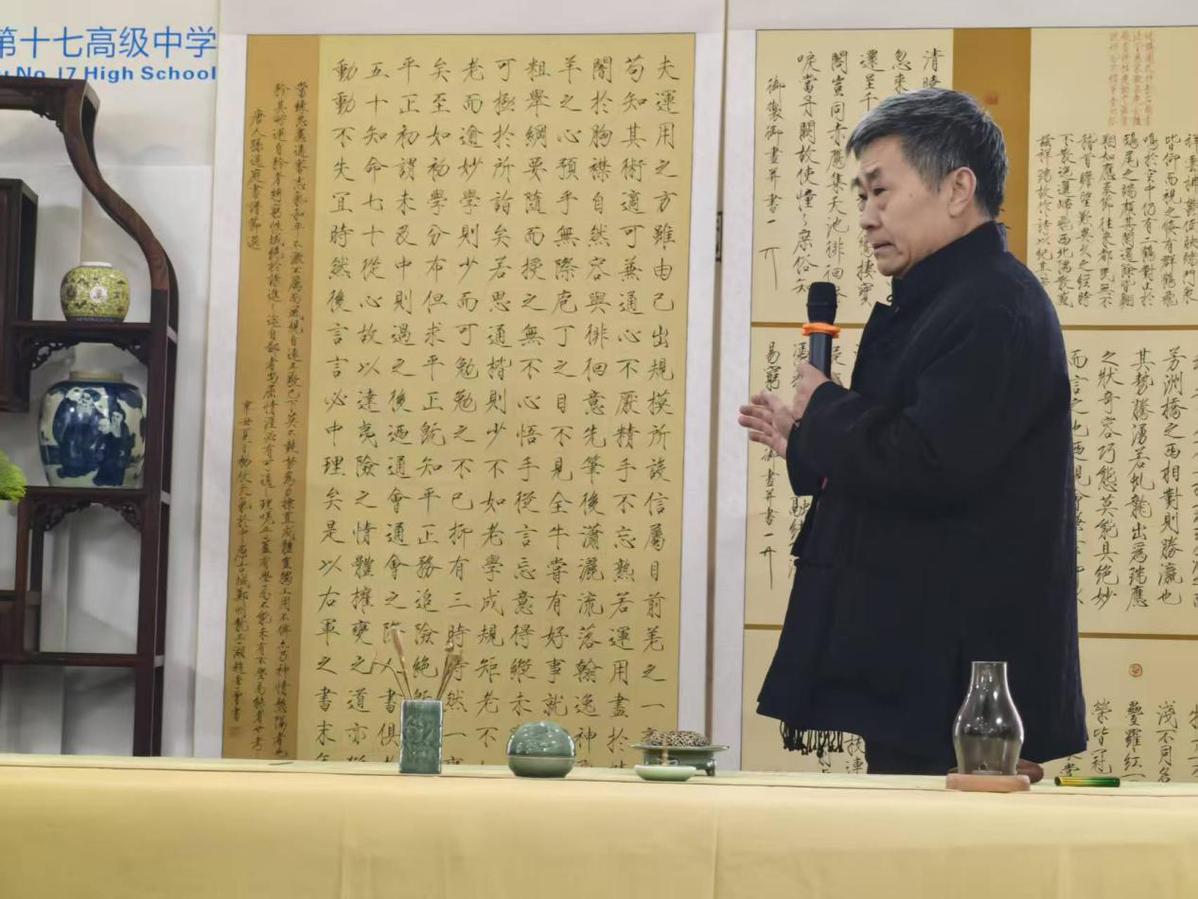 紧接着,“鼻观之悦·香道 墨香之韵·书法”篇章将活动推向另一个高潮。国家高级香道师静铭进行了宁静深远的宋代篆香表演。从行礼入座、调息静心到“隔火熏香”,每一个动作都充满敬意与禅意,让一缕馨香引导众人观照内心,感悟“鼻观”之妙。随后,知名文化学者、书法大师赵季曾先生挥毫泼墨,以劲瘦飘逸的瘦金体写下对联:“十七中英才荟萃,宋四雅暖室生春”。他现场讲解了对联的寓意,并深入浅出地剖析了宋徽宗瘦金体书法“天骨遒美,逸趣霭然”的艺术特点,将书法背后的历史与文化娓娓道来。