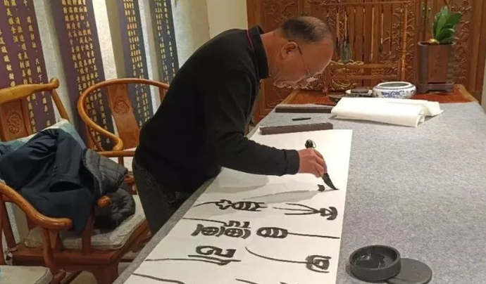 活动现场,最引人注目的当属书法家孙伟带来的悬针篆书法了,吸引了不少观众前来观摩。悬针篆,是一种脱胎于小篆的字体,又被称作垂针篆,可以看作是篆书的异体字,它的特点就是竖画收笔出锋,锋就像钢针倒悬一样。孙伟于2021年完成八千多字悬针篆电脑字库,并被国家版权局命名为"孙伟悬针篆"电脑输入法,并有《悬针篆书法》专著,形成了当代悬针篆研究标志性成果。