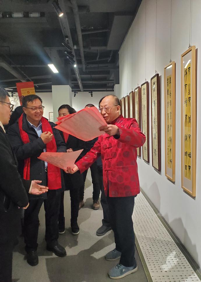 在悬针篆展区,悬针篆传承人孙伟借助新莽悬针篆钱币和书法作品进行了详细介绍,尤其是对悬针篆的历史、书法艺术和当代创新重点介绍,悬针篆是一种脱胎于小篆的字体,又被称作垂针篆,它的特点是竖画收笔出锋,锋就像钢针倒悬一样。孙伟的讲解内容生动有趣,一幅幅笔墨更是雄健洒脱、气势恢宏。活动现场,孙伟还结合春节传统文化现场挥毫泼墨,写下寓意喜庆吉祥的“福”字赠予各位来宾,大家纷纷折服于悬针篆的艺术魅力。