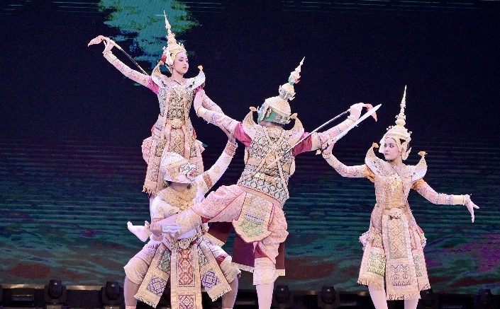 整场展演以“艺韵共传承”为主线,中泰节目交替呈现,精彩纷呈。泰方带来了国家级非遗孔剧《罗摩衍那》经典片段《出征》与《哈努曼擒素攀玛查》,以面具舞剧再现史诗传奇;北、中、南、东北四大区域民间舞蹈依次登台,涵盖柔美的指甲舞与烛舞、激昂的萨查特里舞、典雅的诗暖舞以及融合“鬼面舞”元素的依善舞,展现了泰国多元文化魅力;压轴的泰拳舞蹈以“拜师舞”开场,融合仪式与技艺,彰显了力量与敬畏。