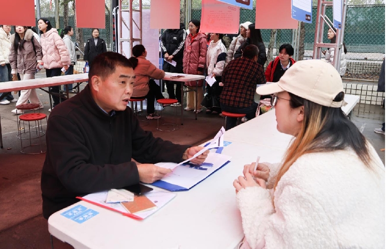 10月25日,河南师范大学西校区篮球场上热闹非凡,一场“智慧化、沉浸式”的模拟面试正在这里上演——2022级本科生徐冰珂面对AI面试官,从容应答古诗文教学策略相关问题,系统实时生成涵盖语言表达、逻辑层次与表情管理的深度测评报告。这是河南省毕业生就业市场师范类分市场暨河南师范大学2026届毕业生秋季双选会的生动缩影,科技赋能与精准服务交织,为毕业生搭建起通往职场的“快车道”。