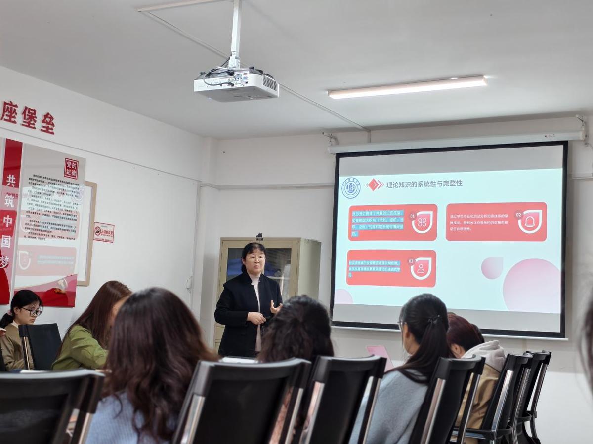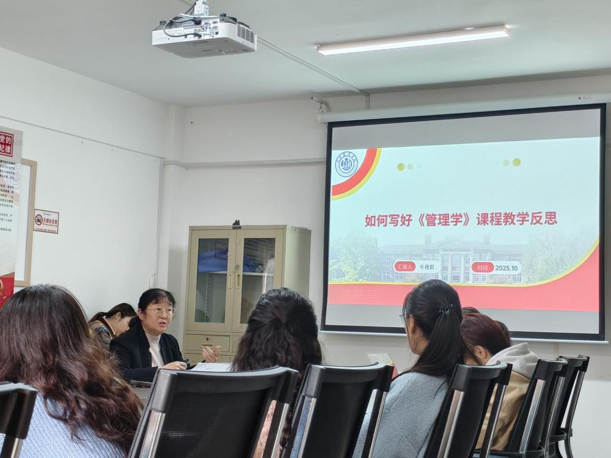 本次培训会聚焦“教学反思赋能课堂提质”核心主题,牛艳莉院长精心筹备并制作专题课件,以自身主讲的《管理学》课程为实践样本,展开长达四十分钟的沉浸式教学反思示范。她强调,教学反思是教师专业成长的“必经之路”,更是连接教学实践与质量提升的“关键桥梁”,尤其对新入职教师而言,常态化的教学反思能快速助力其找准教学定位、补齐能力短板,实现从“站稳讲台”到“站好讲台”的跨越。