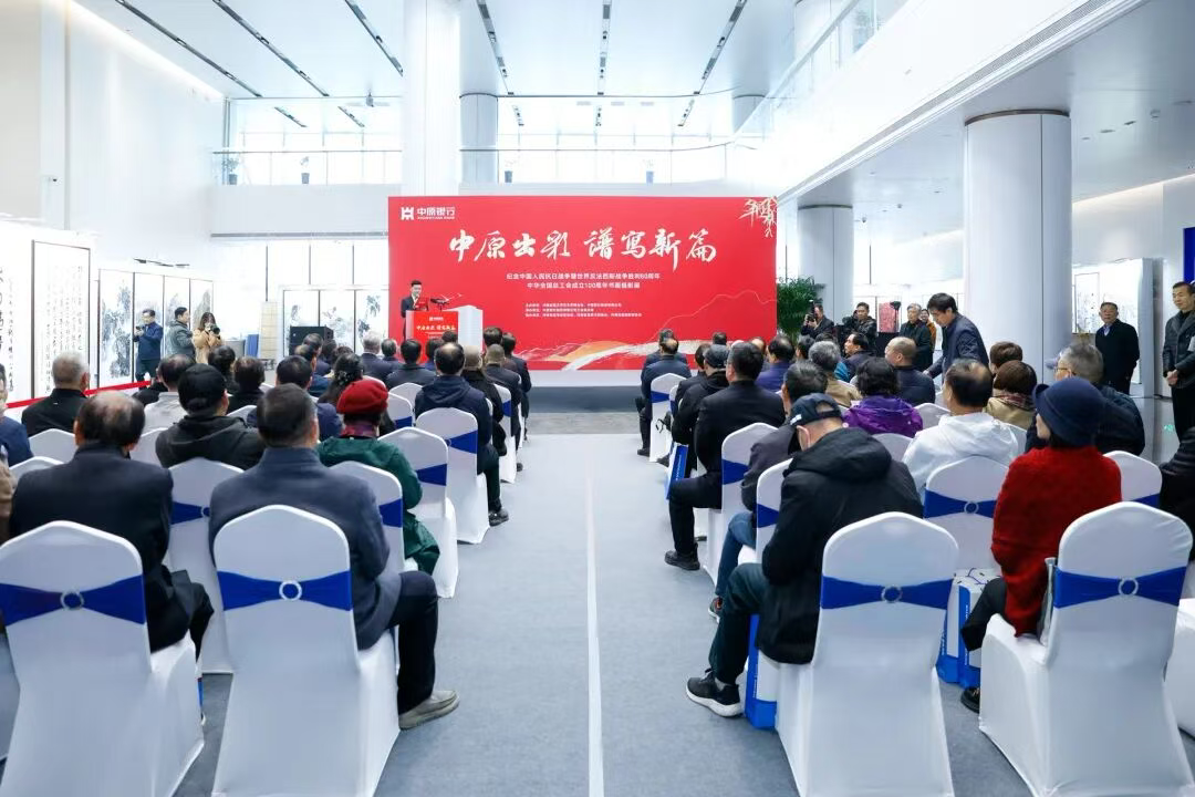 10月28日,经过数月的精心筹备,在热烈、欢快、喜庆的气氛中,由河南省直文联、中原银行联合举办的“中原出彩 谱写新篇——纪念中国人民抗日战争暨世界反法西斯战争胜利80周年、庆祝中华人民共和国成立76周年、中华全国总工会成立100周年书画摄影展”在郑州市郑东新区金融岛中原银行总部大厦一楼大厅隆重开幕。