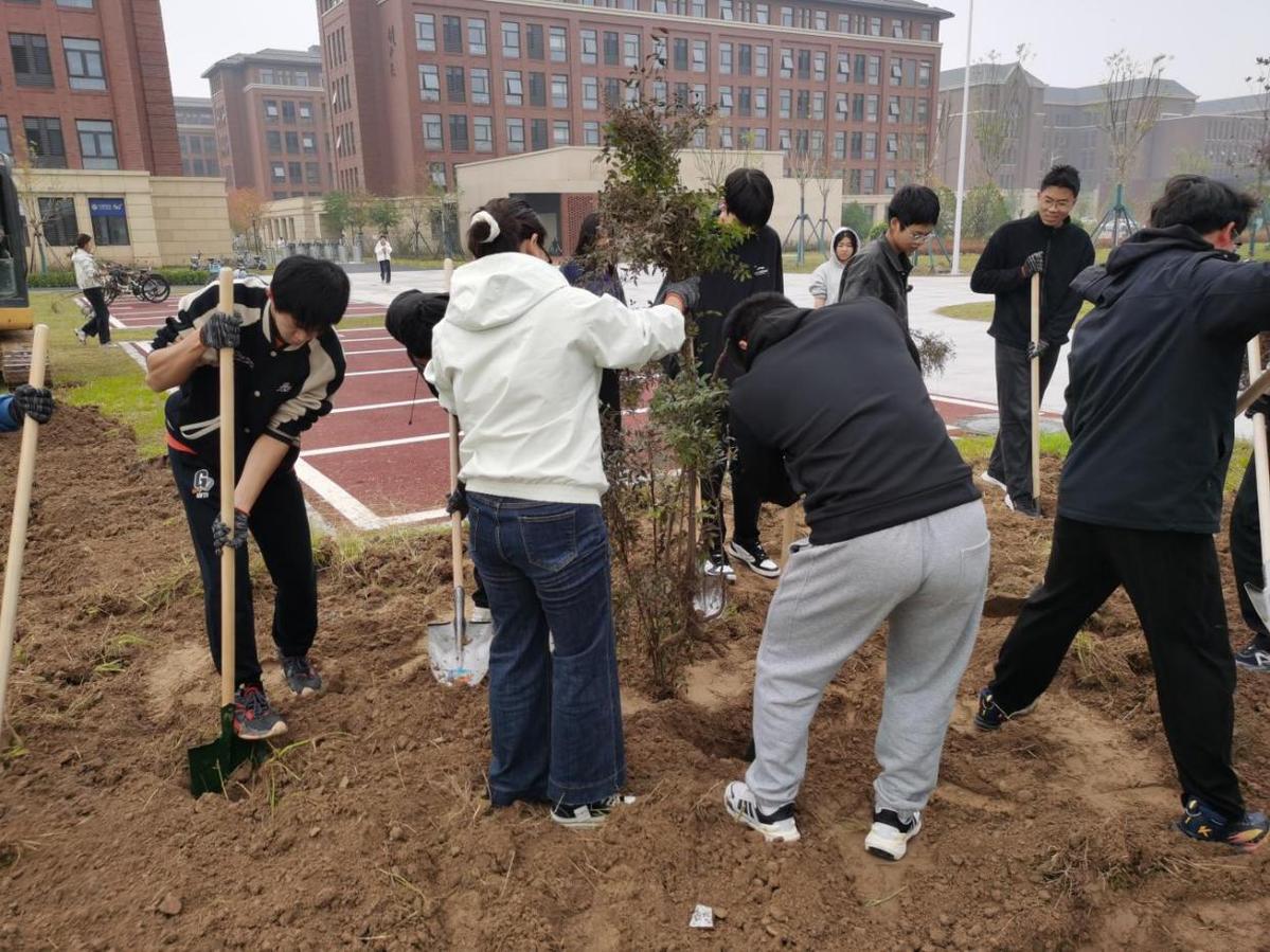 植树活动当天,该校党委常委、副校长杨宝刚与职能部门值班人员组成“劳动导师团”,现场示范挖坑深度、培土力度、浇水用量等栽种技巧。各学院、书院实践小队师生分工协作,搬运带土球的法桐树苗、精准测量株距、扶正南天竹与大叶女贞苗株、分层踏实培土、清理土壤石块杂草。这场以“浇花浇根、育人育心”为主题的植树绿化活动,既是该校劳动教育“科技创新港校区特色实践体系”的启动之举,也是师生共建共享美丽校园的开篇行动。